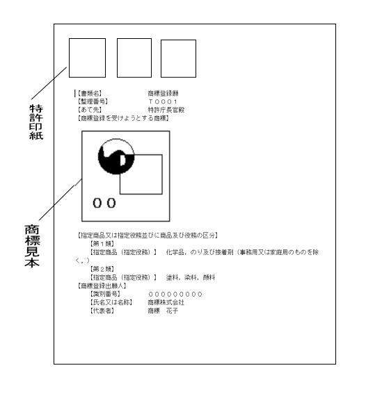 商標見本は 8cm X 8cm のものを願書に完全に貼り付けます。変色しやすいもの,例えば写真やクレヨン書きのもの等はいけません。